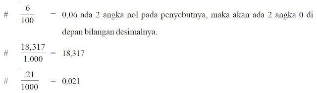 - Untuk pecahan-pecahan yang penyebutnya bukan bilangan 10 atau kelipatan 10, yang harus dilakukan terlebih dahulu ialah mengubah penyebutnya menjadi bilangan 10 atau kelipatannya.